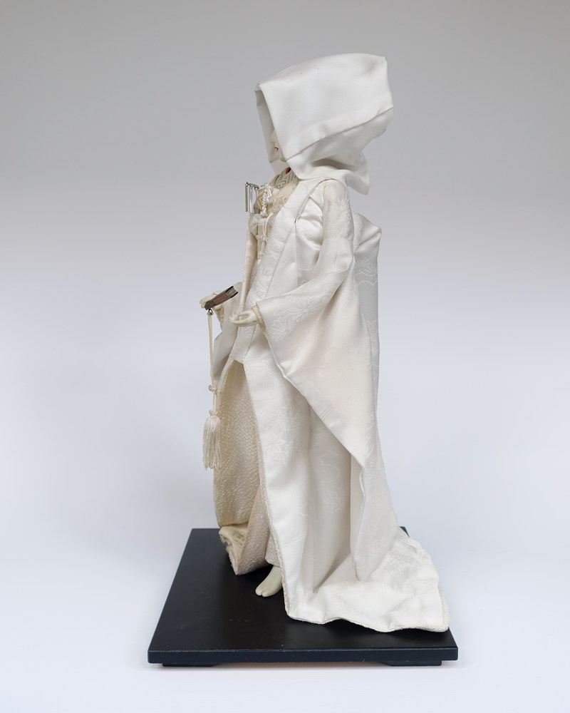 Large Japanese bride doll dressed in traditional Shiromuku style, as used for Shinto or Buddhist wedding ceremonies. All parts of this costume are white*, like the hat (wataboshi) and the other accessories. On the chest the bride carries a small dagger (kaiken or futokoro-gatana; formerly carried by men and women of the samurai class for self-defense indoors) and a box (hakoseko) with a mirror, comb or lipstick in it. The gold fan symbolizes luck. Size 43 cm. No marks.